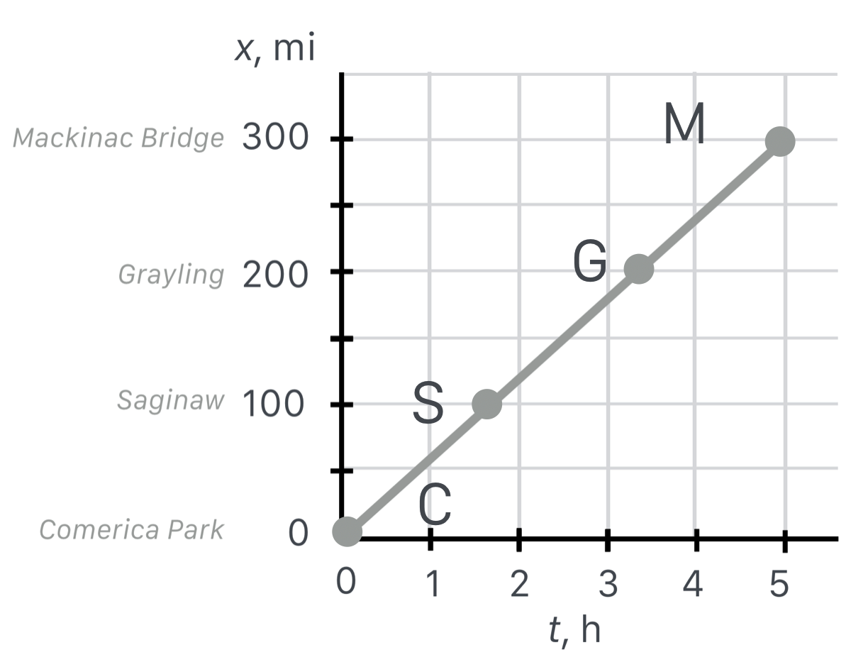 You see the various towns along the way and in this trip we’ll be abstract in a couple of ways. That curvy line following the actual roads we’ll pretend is just straight so we could define a coordate system with \(x\) following the SE to NW path and in which \(x=0\) is at Comerica Park. The second way we could abstract this scenario is to imagine that we’re so good at the controls that we can drive at a constant 60 mph the whole way—no stopping, no slowing down or speeding up.