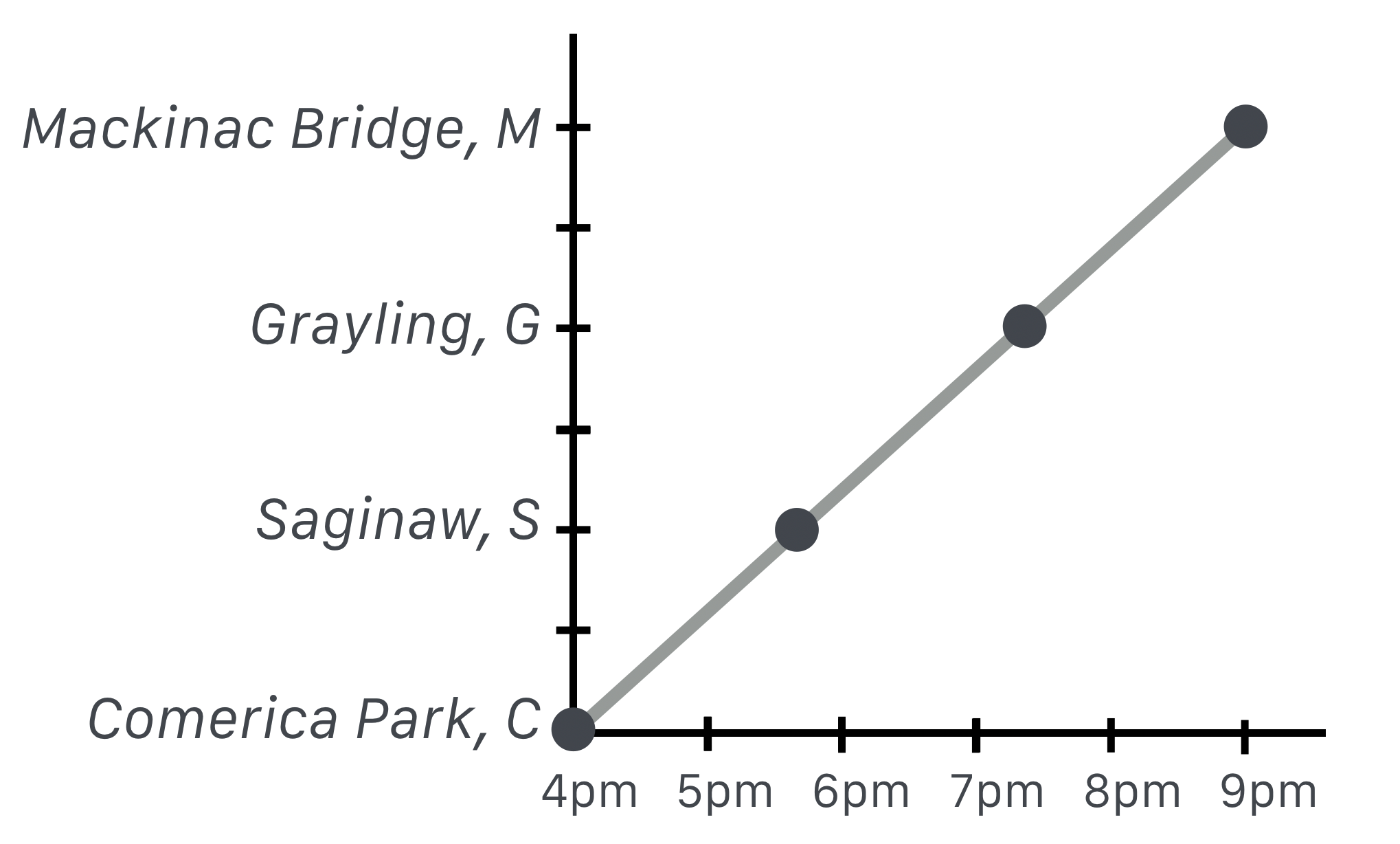 If our copilot got our her watch and wrote down the time that we breezed through Saginaw, Grayling, and when we got to the bridge she could create a graph which would look like this.