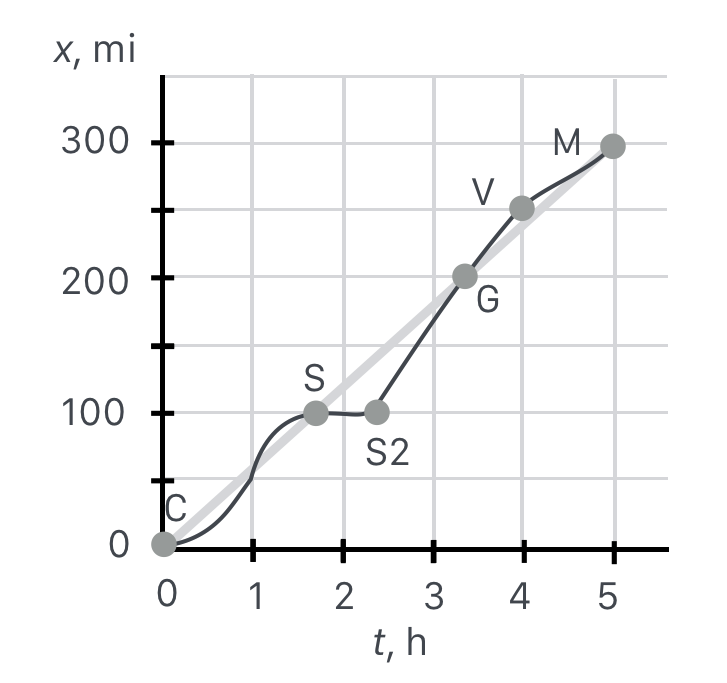 Here the dark line is meant to represent a more realistic journey with the light gray line showing the originally ideal, constant velocity trip. Notice that we start slow and speed up and then at Saginaw we stop for dinner: the distance is unchanged for almost an hour until point S2 when we start up again. And boy, do we ever. We fly through Grayling G) on to Vanderbilt (V) and then more slowly, get to the bridge.